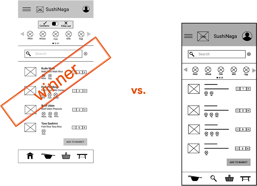 Drafting iterations of each screen of the app on paper ensured that the digital version of wireframes address user pain points.To find food to order quickly I designed filter icons to filter out meals by ingredients to help users save time.